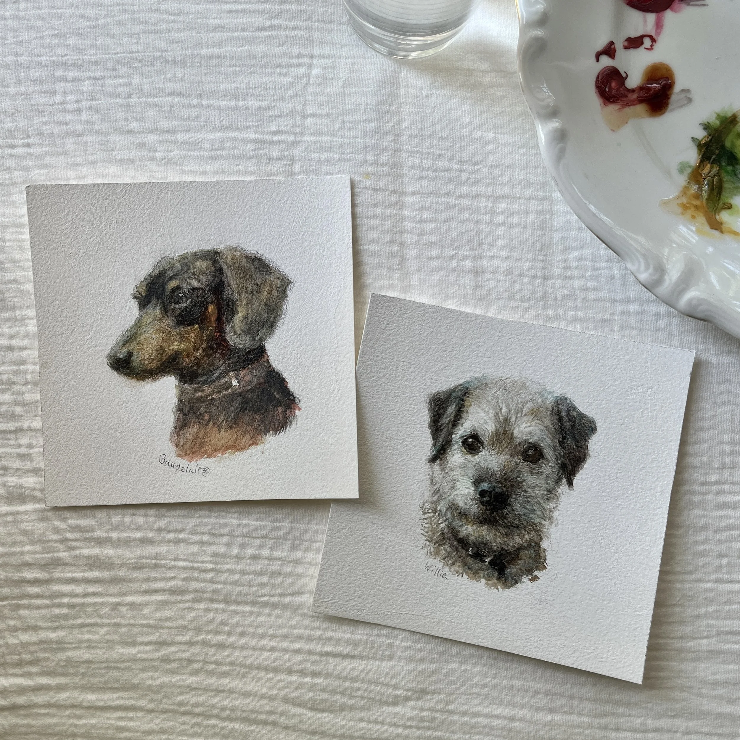 Currently, I’m offering 5”x5” (inch) heartfelt pet portraits in water media on thick Arches painting paper.